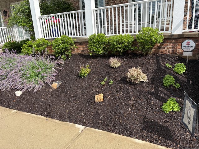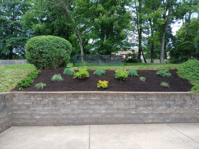 Removed Existing Grass. Installed weed block paper, new shrubs and new mulch.