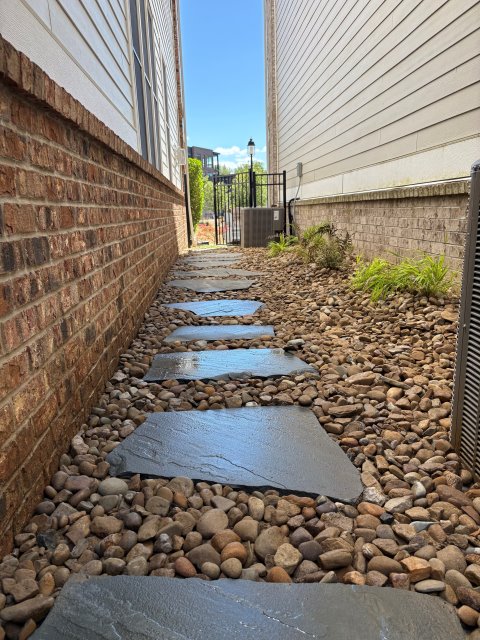 Removed existing grass. Installed weed block paper, flag stone pathway and new plants.