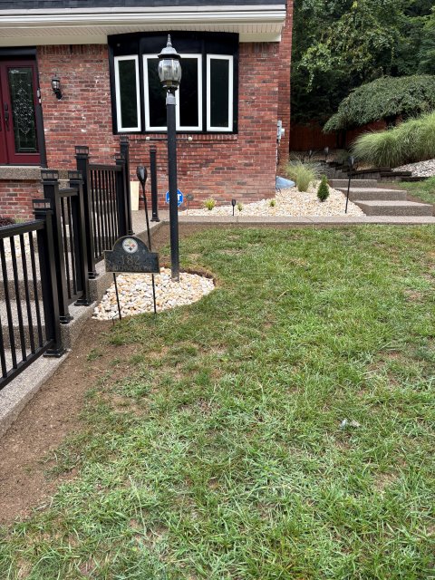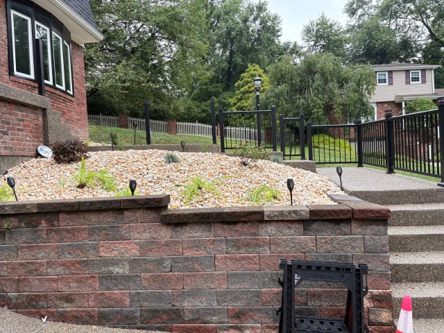 New sidewalk installed by Tavella Concrete. Mangretta Landscaping LLC installed new plantings and new river rock.